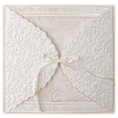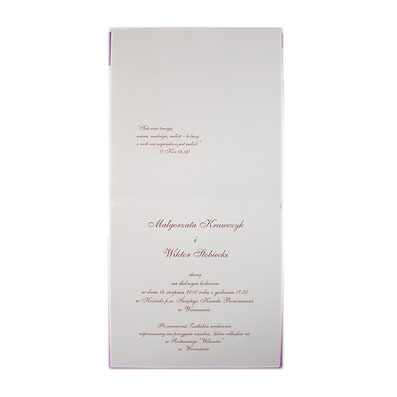 W komplecie ozdobna koperta z finezyjnym wycięciem przewiązana atłasową wstążką, dostosowana formatem.